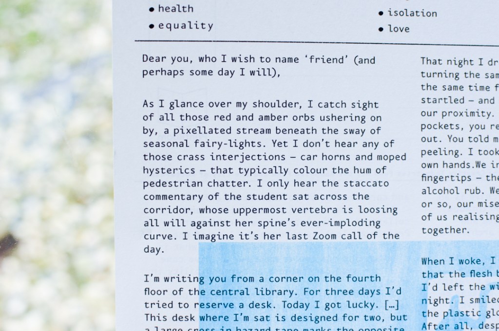 In late 2020, Kees, Hannah Dawn and Karolina of Notes on Hapticity were invited to delve into PrintRoom’s archive of artist(ic) and DIY publications. This archive, spanning several thousand documents, recollects PrintRoom’s network of international collaborators and thematic developments in the wider field of independent publishing. We were invited to explore how we encounter and relate to themes such as care, isolation, self-reliance, and community in the archive; further, we reflected on how we relate these materials to our own memories and internal collage of references. Predicated on these personal associations, each of us made a selection from the archive and responded to them through our respective registers, encompassing lyrical, essayistic and epistolary tonalities.
